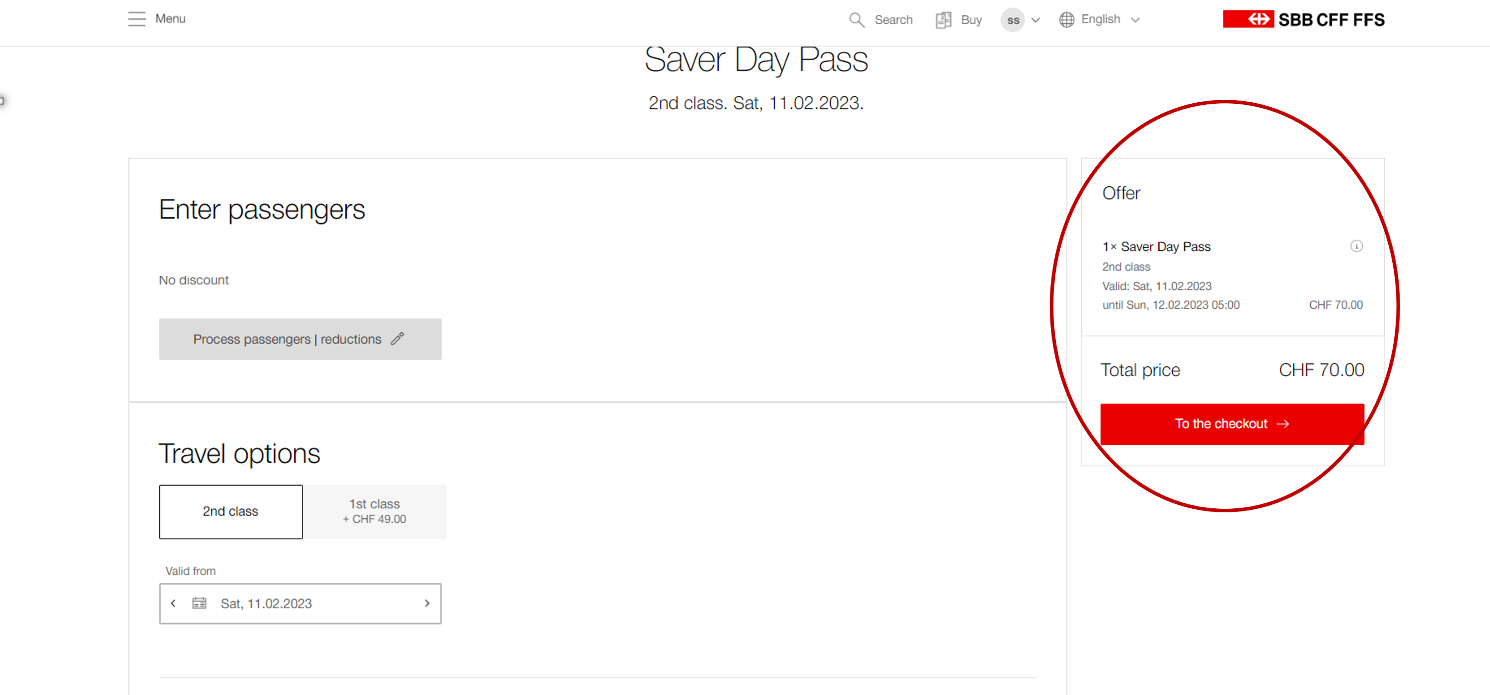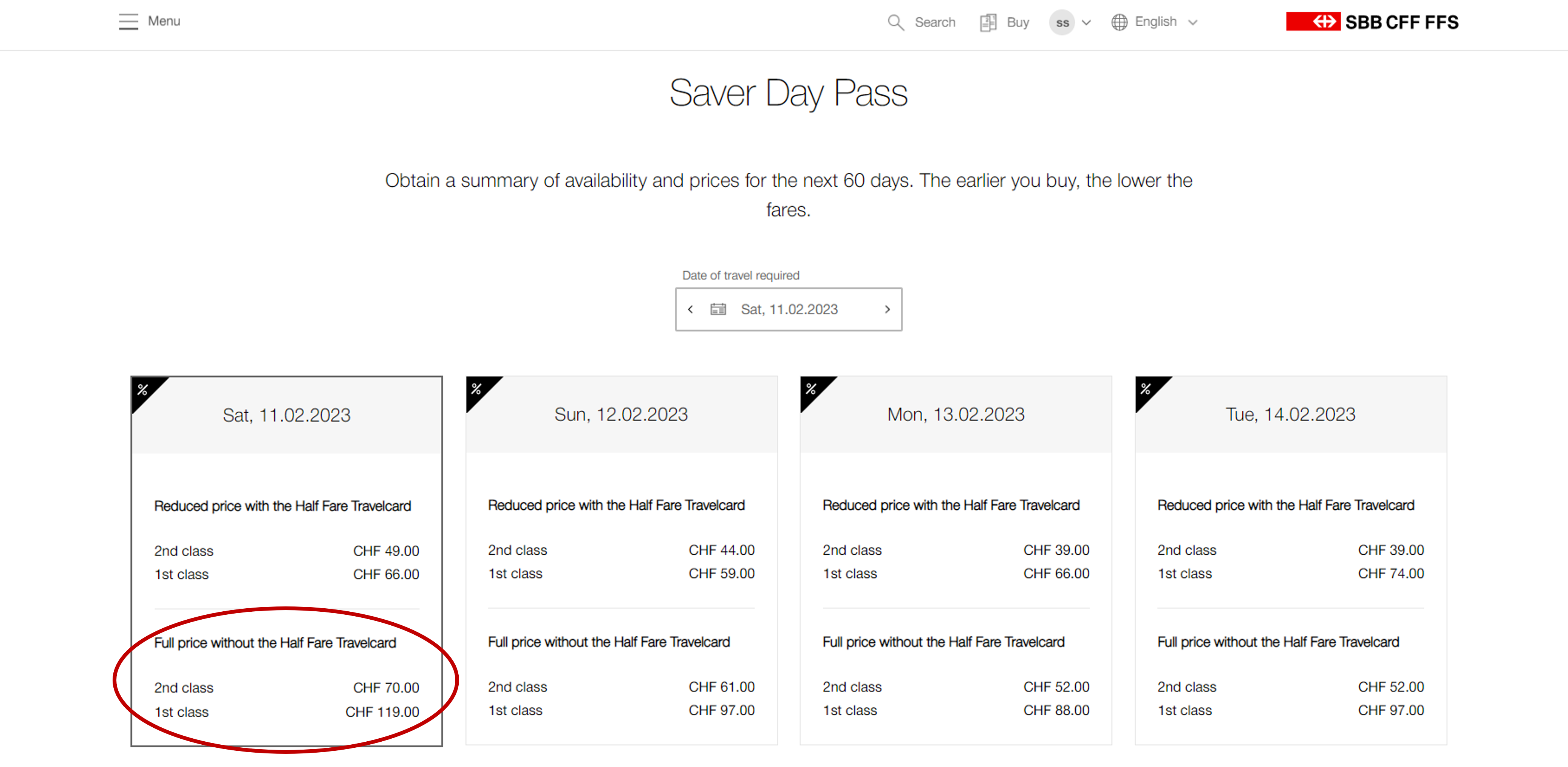 23년 2월 11일 세이버데이패스 가격은 2nd class CHF 70.00, 1st class CHF 119.00입니다.