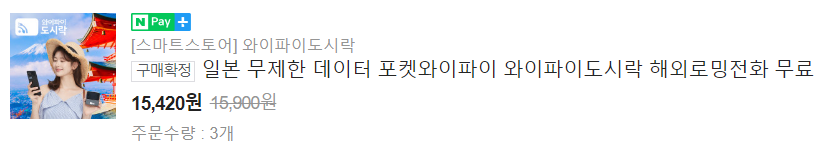 네이버 스마트스토어 와이파이 도시락에서 2박 3일 포켓와이파이 대여 가격은 15,420원 내돈내산 했습니다.