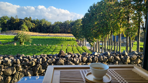 차를 마시며 밖으로 보이는 잘 관리된 녹차밭의 풍경은 너무나 아름다워 제주 여행 중 편안한 힐링의 시간이 되었다.